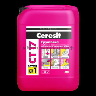 Грунтовка CT 17 предназначена для обработки поверхностей перед нанесением штукатурных и напольных смесей,плиточных клеев и т.д. Применяется для обработки всех видов впитывающих оснований: бетона, цементно-песчаных штукатурок и стяжек, известковых и гипсовых штукатурок, легкого и ячеистого бетона, ангидритных стяжек, кладок из кирпича и природного камня, древесностружечных и древесноволокнистых плит, гипсокартона и т.д.Обладает высокой проникающей способностью, снижает впитывающую способность оснований, связывает пыль, укрепляет поверхность, предотвращает пересыхание тонкослойных выравнивающих смесей, повышает адгезию материалов к основанию, повышает растекаемость напольных смесей и предотвращает появление пузырьков воздуха на выравнивающем слое. Благодаря содержанию пигмента позволяет легко отличить обработанную поверхность.